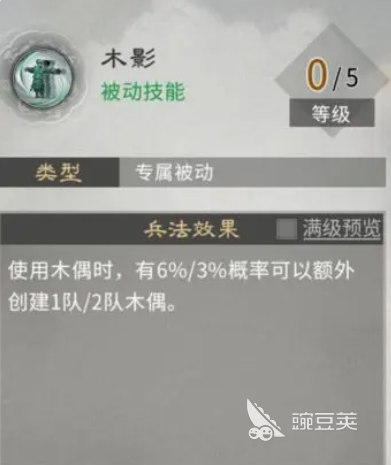 木影这个兵法目前带来的效果就是木偶产出数量,因为上面提到过,这里带来的木偶基本就是为大家带来是额外攻击的加成效果,所以这里利用这个木影搭配的话,就可以提高大家一次召唤出来的木偶数量,用来布防的话,可以达到的是一个长期有效的效果,特别是大家喜欢参与战斗的玩家,利用这个效果也可以用来防御,如果是需要攻击的玩家,利用这个木云战法也可以提升整体的攻城速度。