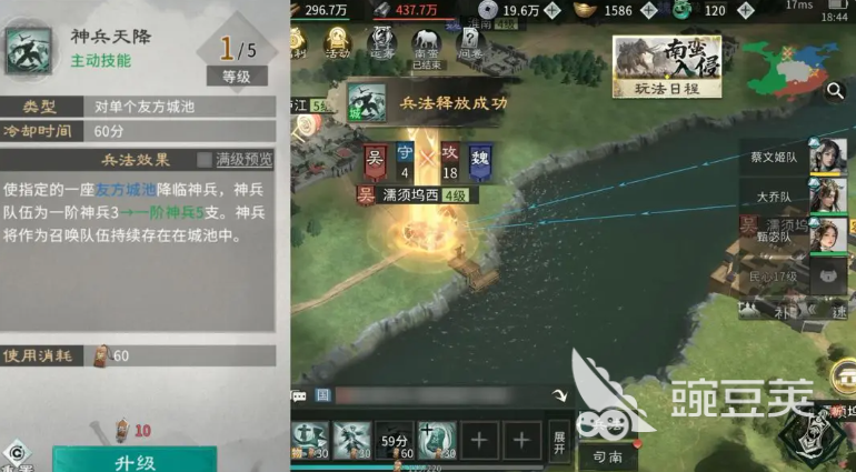 接下来给大家推荐的是神兵天降这个兵法,在林系里面是非常出名的,它可以用来紧急支援使用,而且是作用在友方需要的城池里面,可以带来足够的能力,特别是如果使用的情况,是我方守军没有那么多的情况下,用这个神兵天将就可以带来足够的士兵加成,而且此时这个兵法在临时召唤了兵力之后,还可以协助大家进行防守,如果是被攻破之后使用的话,争取到的时间也可以用来进行反攻,不过这个技能释放的情况下,还需要结合目前阵营里面需要的指挥战略来进行安排,所以使用的场合上面是需要大家判断的。