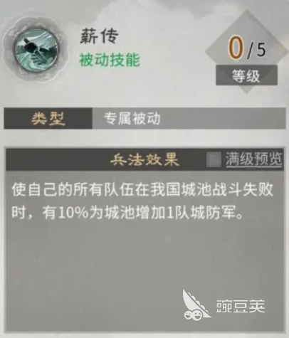 还有一个战法叫做薪传,在游戏当中是在大家战斗结束了之后,可以触发的,也就是说在大家战斗失败之后,此时还可以利用这个薪传生成一队城防军,这个城防军主要的效果就是带来一定的抵抗能力,也就是说可以影响敌人攻城的进攻速度,也可以让大家有足够的城防军,可以保证自己主城的安全,这样就相当于是大家可以为自己得到最后的一段拉扯时间,当然这个效果对于平民玩家来说,后期如果没有什么强势的反击策略的话,这个战法是不太建议使用的,如果后期如果有反转的情况下,大家可以尝试使用薪传为自己得来足够的反攻的时间。