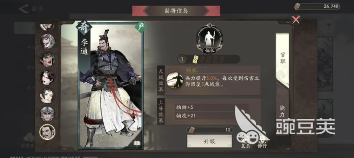 其实在三国望神州里面,如果说到一些主将角色,大家可能都比较熟悉,但是如果说到其中的强度不算高,但是一般是作为副将用的角色,可能大家就不算很了解了,那么在三国望神州李通怎么样进行介绍的时候,大家就是主要围绕着一个副将也就是李通来给出的一些介绍,游戏当中他作为副将的话,一定要找到一个比较适合的武将搭配,才可以达到这个副将最好的优势。