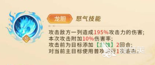 他的怒气技能以及后期天赋可以解锁的能力,因为普攻技能上面除了单体攻击之外,不会带有附加的额外伤害,所以大家想要用它的技能效果主要是用怒气技能,赵云的怒气技能叫做龙胆,这个技能在攻击敌方的时候,是可以对一列敌人作为自己目标带来的基础攻击能力,有195%的伤害,而且在攻击的时候,可以附加一定的伤害概率加成,这里基础附加的百分比是有10%的,虽然不高,但是搭配上面的专武以及下面的天赋,效果也是有不错的提升上限。