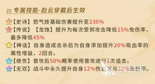 另外在达到绝世品质之后,他可以为自己的普攻带来一半的概率,触发一次追击,那么利用这个追击的效果,赵云也可以得到足够能力,后期输出持续能力最强的时候,还是在他达到无双品质的时候,此时给他穿戴这个专武,可以为战斗里面带来一个永久提升的能力,此时提升的话,作用在他的伤害率以及免伤率上面都会有在基础的数值上面提升12%的效果,所以此时他在整体能力提升上面会更加全面一些,除了其中的专武可以给他带来大部分提升能力之外,专属技能效果上面大家也要注意的是。