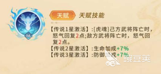 如果是敌方武将阵亡的时候,他也会得到两点的怒气恢复,所以赵云他在怒气整体的恢复数值上会比很多武将都要快一些,达到传说二星的时候,可以激活生命上面7%的上限加成,而传说三星就是在防御上面同样百分比的加成,所以这个效果相对他的天赋整体来说,只要达到传说1星,他的能力就有足够高的提升了。