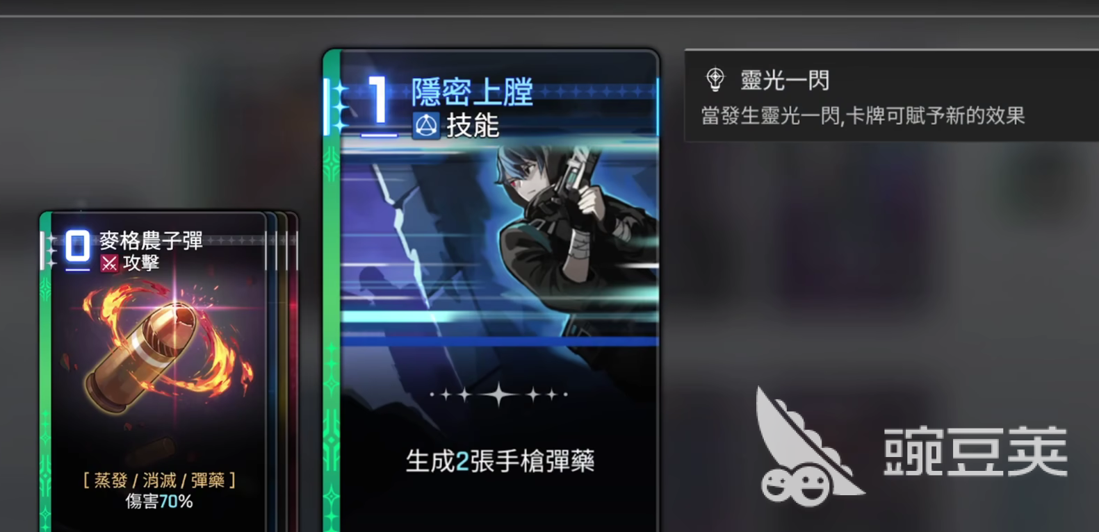 他的第二张独特卡牌是隐秘上膛,能够为玩家们获取两张手枪弹药;而第三张图的卡牌则是获得100%的护盾,使用弹药卡牌可以直接将原本的伤害量增加到120%;而第四张卡牌则是魔眼乱舞,随着玩家们使用的弹药卡牌数量越多,它所造成的伤害会进行叠加,能够很好的叠加爆发伤害,打出高输出。
