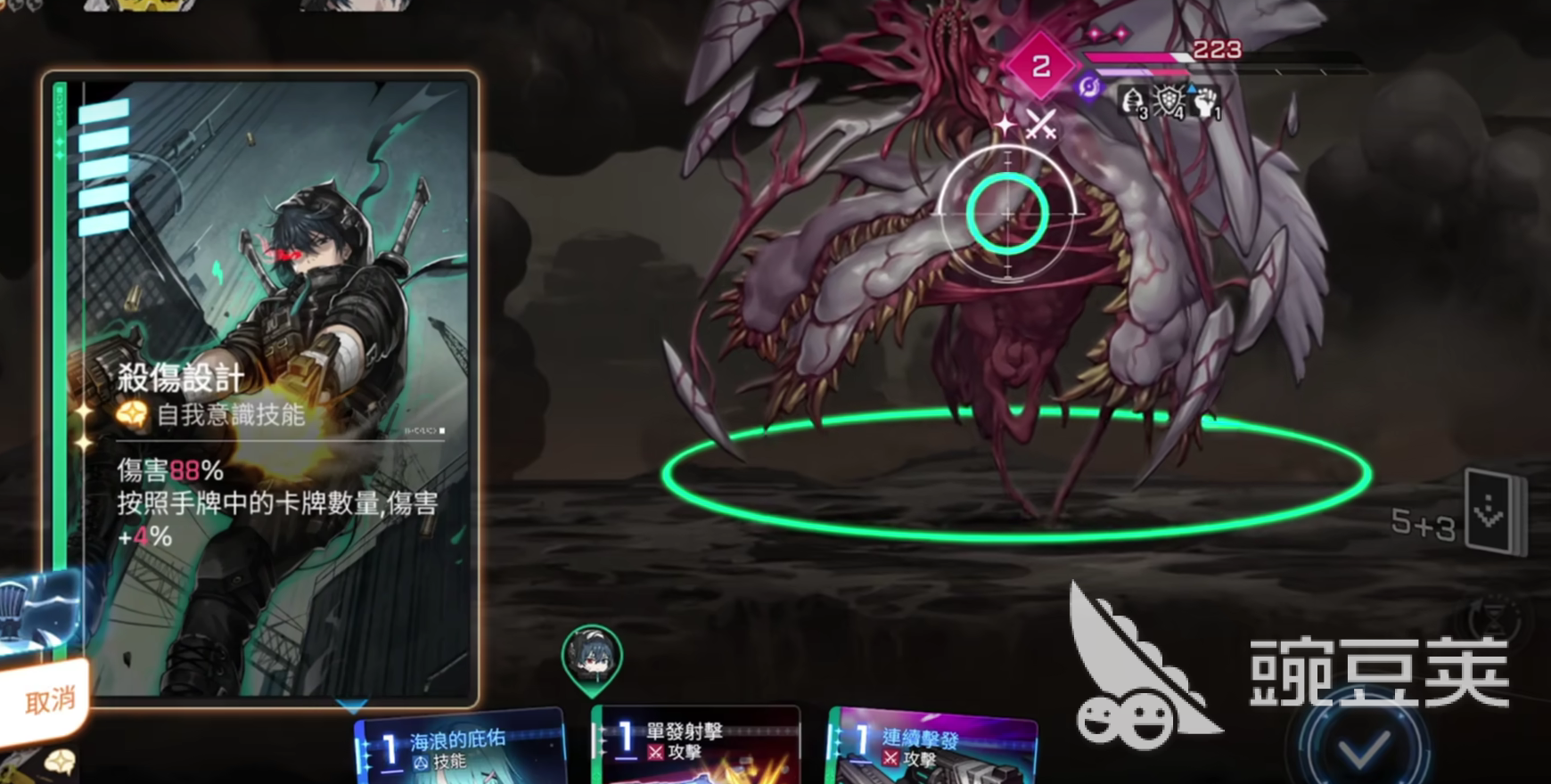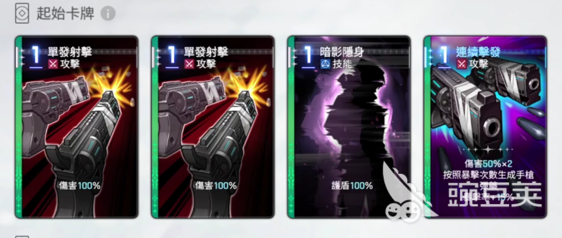 第五张则是拥有100%的伤害,并且使用攻击卡牌的数量会增加角色伤害量,这个角色的大招会直接增加伤害到250%,需要注意的是大招看重的并不是剩余的卡牌数量,而是弹药,所以在使用大招之前,玩家们千万要将弹药都用完,再使用大招,这样可以更完美的打出输出。