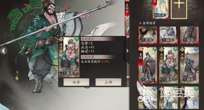 在大家解锁了副将位置之后,基本前期用到的都是一些杰品质的副将,因为超品质的副将后期在后期加难度上面会更高一些,所以前期过度用这个品质的副将就可以用了,那么淳于琼就是此类品质的副将之一,在游戏中他也被陈称作为是乌巢酒仙,其中他的属性是严,那么跟同属于严品质的其他副将一起辅助主将的时候,会有足够的加成效果,淳于琼目前在天赋效果上面带来的是一个恃力的效果,这个天赋会为他带来反击效果上面的伤害提升,一次性提升就会有15%的加成效果。