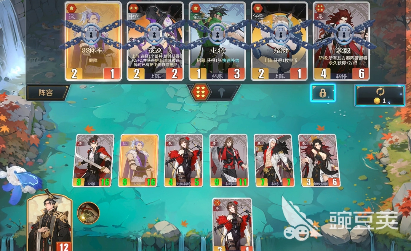 此外,在局内对战时,若玩家想转换阵容,还请不要将已合成的金卡直接卖出,最好先将它们留在自己的手牌里,方便需要时把它们换上阵。同时,商店里的部将是可锁定的,当各位发现商店里有自己需要的卡牌能让自己完成金卡合成,自己又缺少金币去购买时,可先将该部将锁定,待下一回合领到金币后再去买来合成。