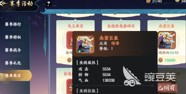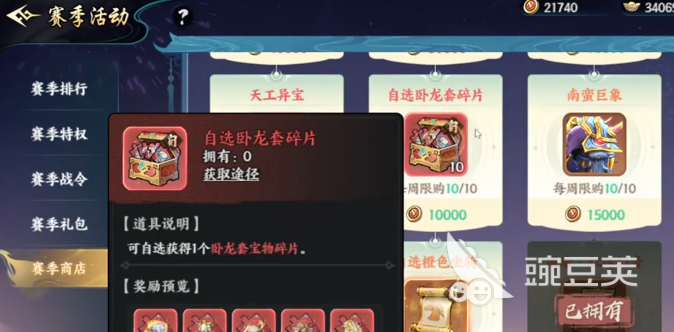 今天所为大家分享的,那就是赛季商店的兑换区,这一次还是比较有诚意的。例如这里就有卧龙套装宝物碎片,现在居然可以直接用赛季币去兑换。要知道这套装以前也只能够在青梅煮酒活动里面通过免费的方法获取,现在不需要氪金,在积攒足够赛季币之后就可以获取。另外在这里还有南蛮巨象,以前要么是冲榜单排名,要么是冲刺活动里面去碰运气。就算在荣誉商店里面可以换,但每个星期也只能限购一个,提升的速度还是非常慢的,所以现在就可以直接获取。