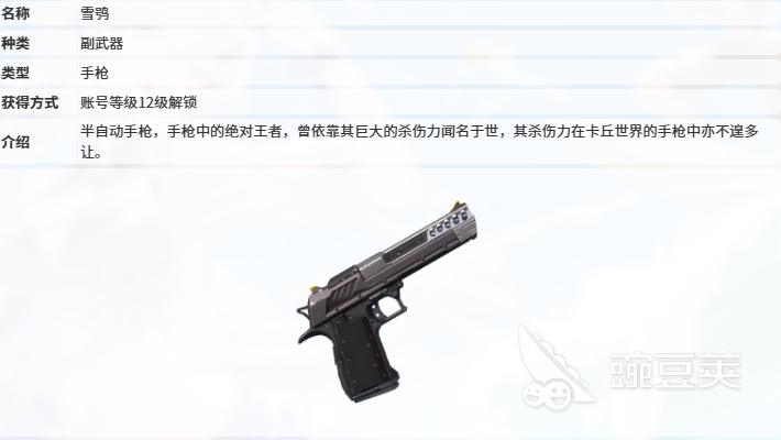 最后为大家推荐的就是雪鸮手枪,这是目前游戏当中很多高手喜欢用的一把副武器,虽然在游戏当中使用它的风险比较高,但是能够带来的输出回报也是非常高的,而且在单发伤害数值上面,它带来的贴脸伤害一次性就能够达到42点的输出效果,如果满足了爆头的优势,那么这里能够达到的是102点的输出能力,所以不管是中距离的输出还是远距离的输出,它带来的伤害绝对是可用的,不过对于很多玩家来说,它比较考验大家的精准度,如果如果想要造成一枪翻盘之类的反击效果,它能够带来的射速就是非常不错的,就是要看玩家是否能够用好它。