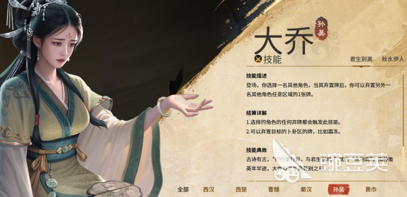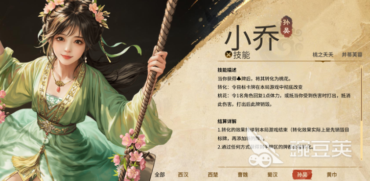 最后还可以为大家介绍一个小乔,小乔在吴国武将里面,其实很多玩家喜欢的是她的外观,这里小乔可以根据自己获取的一些黑桃花色卡牌,将其转化为桃花卡牌,这里转化成功之后,可以让这个卡牌在本局游戏里面彻底的改变自己的花色,而且还可以让其中一名角色带来一点体力值的恢复,所以如果主将他的体力数值比较低的情况下,用小乔就可以为队友带来足够的恢复能力。