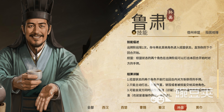 如果使用的是鲁肃这个角色,在吴国武将里面,他可以带来的是一个结盟的效果,此时的话是比较需要队友帮助的,因为它可以令两个角色都进入到这个状态里面,直到下一个回合行动的时候,结盟状态里面其中选定的两个角色,他自身的出牌阶段里面可以打出来的手牌,是可以在两个角色之间互通的,所以选择性比较大,当然大家要注意的是,处于静默状态当中的角色,他们打出来的手牌不能是对面新获取的手牌,只能打出之前没有弃置的手牌。