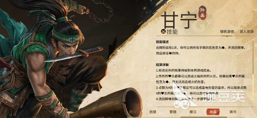 第2个为大家推荐的是甘宁,甘宁在吴国武将里面其实上场的概率非常高,他能力效果上面主要是在出牌阶段可以带来足够的优势,他可以根据自己手中卡牌的花色来进行变化,一般情况下主要是变成黑桃类花色,并且在变化之后可以洗牌此时的话,将手中手牌洗完牌堆之后,他还可以同时拿取等量的牌进入到自己手中,其中进行花色改牌的情况下,他改掉的一些花色手牌都会在当局游戏结束之后恢复,而且其中所有的红心杀牌都是可以造成火焰效果的杀,那么此时利用这样的卡牌效果,可以根据属性来进行火焰类型的伤害,后期根据不同花色的牌大家可以得到的加成会比较多。
