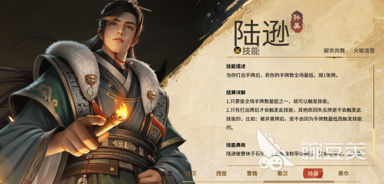 接下来为大家介绍的是陆逊,陆逊在吴国武将里面是需要他打出手牌之后,才可以利用好自己的技能,使用这个技能的时候,只要陆逊有打出手牌,那么后期他的手牌数值是全场最低的情况下,就可以再一次获取一张新的手牌,而且在全场手牌数值最低的情况下,他还可以触发技能之后带来弃置牌的效果。
