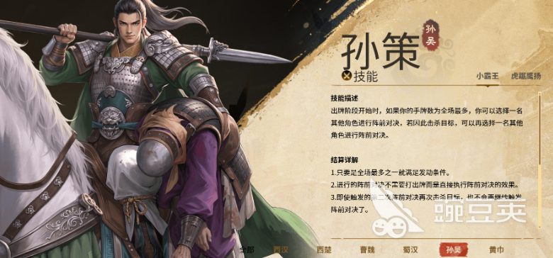 还可以为大家推荐的就是孙策,孙策这个角色在他进行出牌的时候,可以根据目前自己手中手牌的数量来达到一个触发的效果,如果他自身手牌数量是全场最多的话,就可以挑选对手发起对决,这里出牌如果击杀了这个对决目标的话,他此时还可以继续的行动,再选择一个角色进行对决,而且触发了这个行动的话,那么他在竞争之前对决的时候是不需要先打出自己卡牌的,只需要直接执行这里的对决效果就可以了,连续触发了两次对决的效果之后,他主要击杀目标,后面也不会再有第3次,算作是一个连杀的效果。