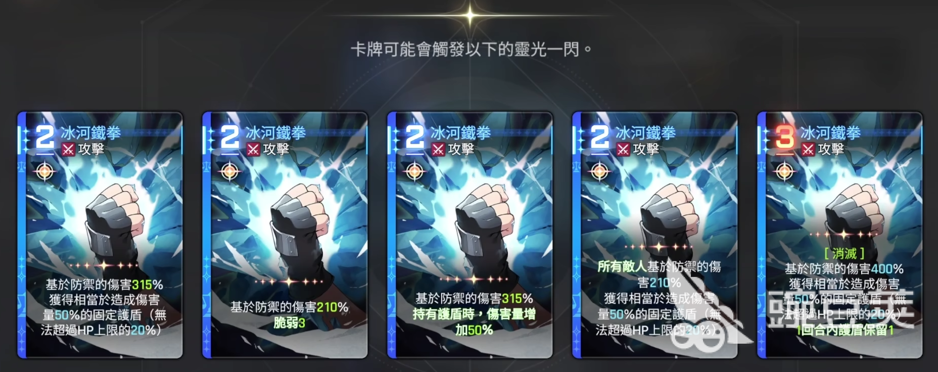第二个技能冰河铁拳,冰河铁拳的基础伤害拥有着120%,并且在攻击之后会获得伤害的50%的伤害护盾,但是他没有办法超过HP上限的20%,我们看一下他的灵光一闪,第一张卡牌直接将基础伤害增加到315%,其他不变;第二张卡牌是基于防御伤害的200%;第三张则是拥有着基础防御伤害的315%,并且有护盾的时候这个伤害还会再次增加50%;第四张的改变不大,变成可以对所有的敌人造成伤害;最后一张不仅基础防御伤害的百分比增加到400%,他还能够在一回合内让护盾再次保留。