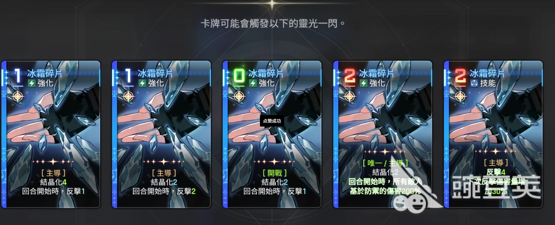 他的技能一冰霜碎片有着自己独特的灵光一闪技能,在他的灵光一闪之后依然有着五个卡牌供玩家们选择,第一个是玩家们可以拥有4个结晶化,并且在回合开始时就可以可以拥有一次反击;第二张卡牌则是可以结晶化2,并且在回合开始时能够得到两次反击;第三张卡牌是拥有结晶化2,回合开始时反击1;第四张卡牌则是可以有结晶化2,并且在回合开始的时候所有的敌人他的基础防御伤害都会增加200%;第五张卡牌则是可以反击4,并且在下一次反击时他的伤害会直接增加30%。
