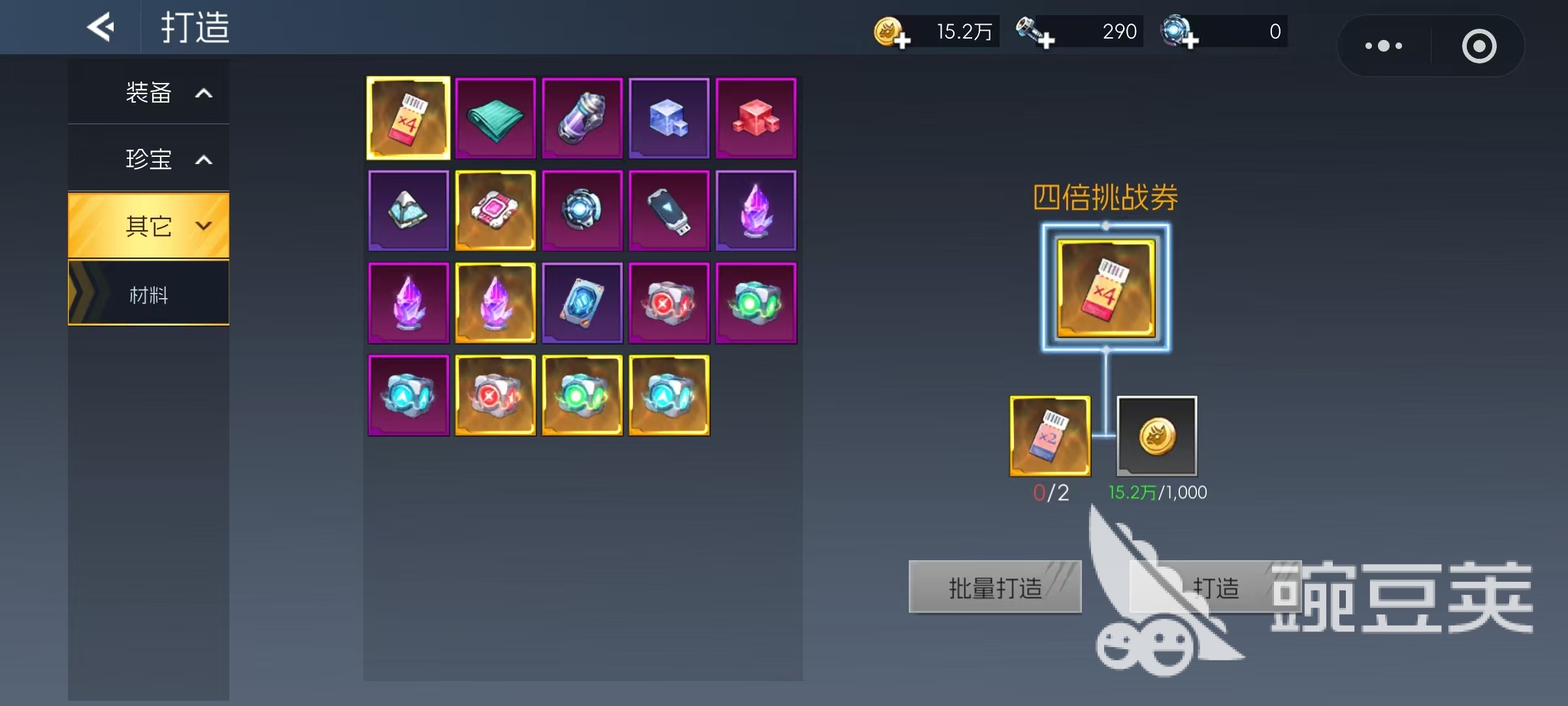 珍宝打造包含锋牙、肩甲与奇物三种类型,每种对应不同战斗增益效果。打造所需材料多来源于逃生之路等限时副本,获取后需进行洗炼以获得理想特性,从而显著增强挑战BOSS时的输出与生存能力,是后期战力突破的重要组成部分。最后是其他类打造,主要涉及功能性材料的合成,如四倍挑战券(由两张双倍挑战券加金币合成)、高级强化纤维(强化纤维+金币)、强化保护剂及高级变换物质等。这些高阶辅材在装备升级过程中起到关键作用。