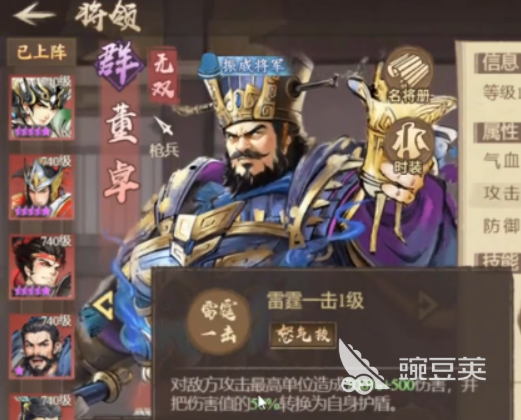 董卓作为阵容中的前排,也是十分重要的。董卓的技能可把自己受到的伤害转化成护盾,特别是在他攻击敌人中最强的那个时,伤害的50%会变成护盾。当场上有麻痹的敌人时,董卓还可以获取相当于自己生命值11%的护盾,持续上8秒。曹操这个角色的技能可以给敌人增加麻痹的几率,董卓几乎就可以保持全程的护盾,让前排的稳定性有很大的提升。