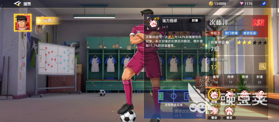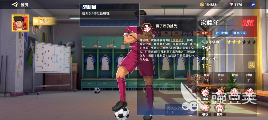 根据强力压迫这个技能的效果,在次藤洋自身的封堵属性上面还可以增加2.8%的数值之后,只要次藤洋发动强力挡球技能,此时对手的控制值日过是低于509的话,那么这个被动则会带来本次封堵威力增加的增益,根据增益这里会有5.7%的封堵属性进行提升,最后在男子汉的挑战技能当中一开场大家就可以获取一定的增益,次藤洋一开场就能拿到3层【战利品】的状态加成,这个加成一旦施加在次藤洋身上就可以持续生效整场比赛,且在叠加到5层的时候数值更高,而且如果是次藤洋发动强力挡球技能失败的时候,根据这个技能的效果此时如果我方门将体力值低于5%的话,次藤洋就可以消耗掉自身之前积攒的3层战利品状态,来为我方门将恢复体力,其中每一层的战利品都是可以给我方门将回复4.4%体力数值的。