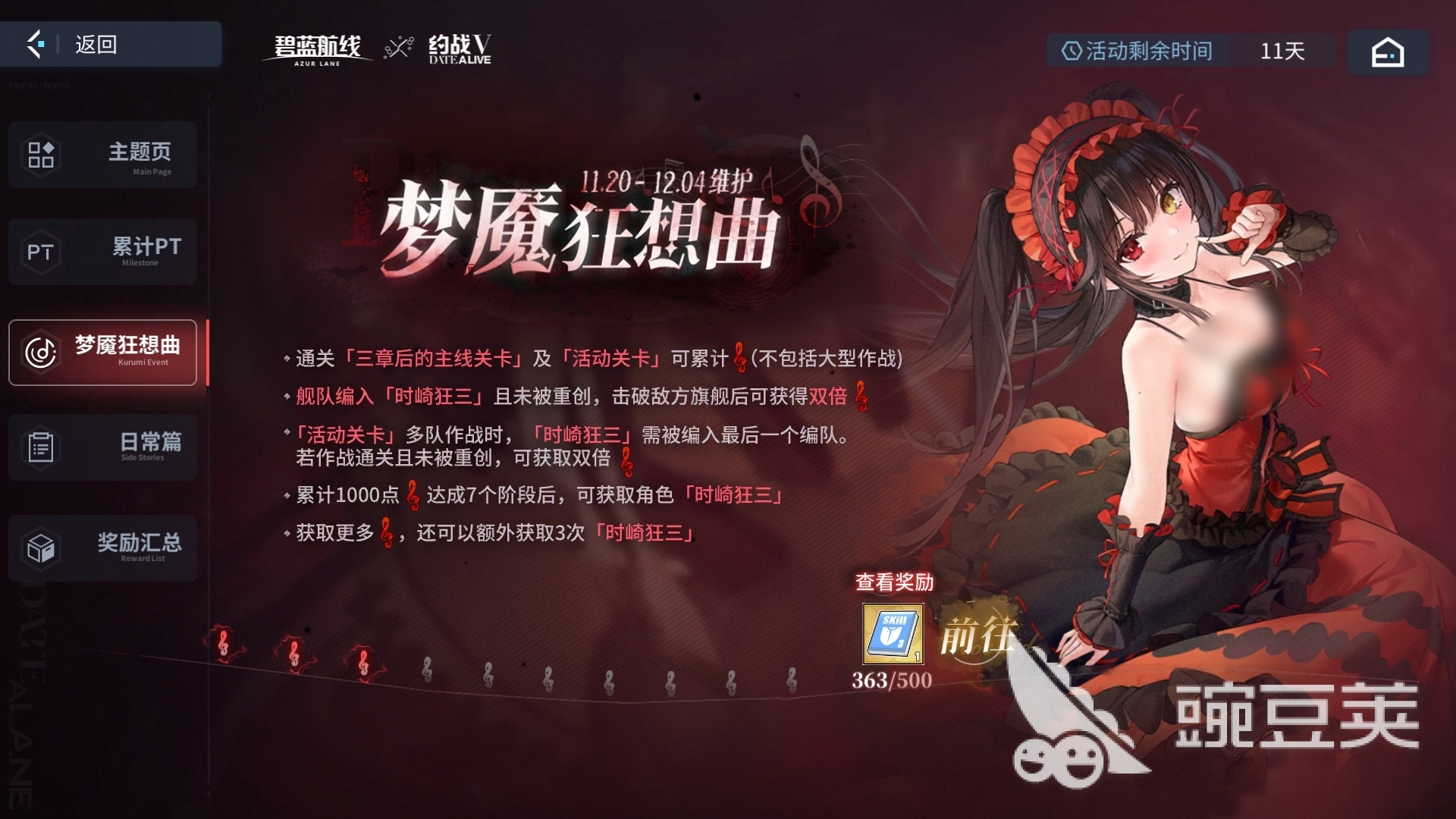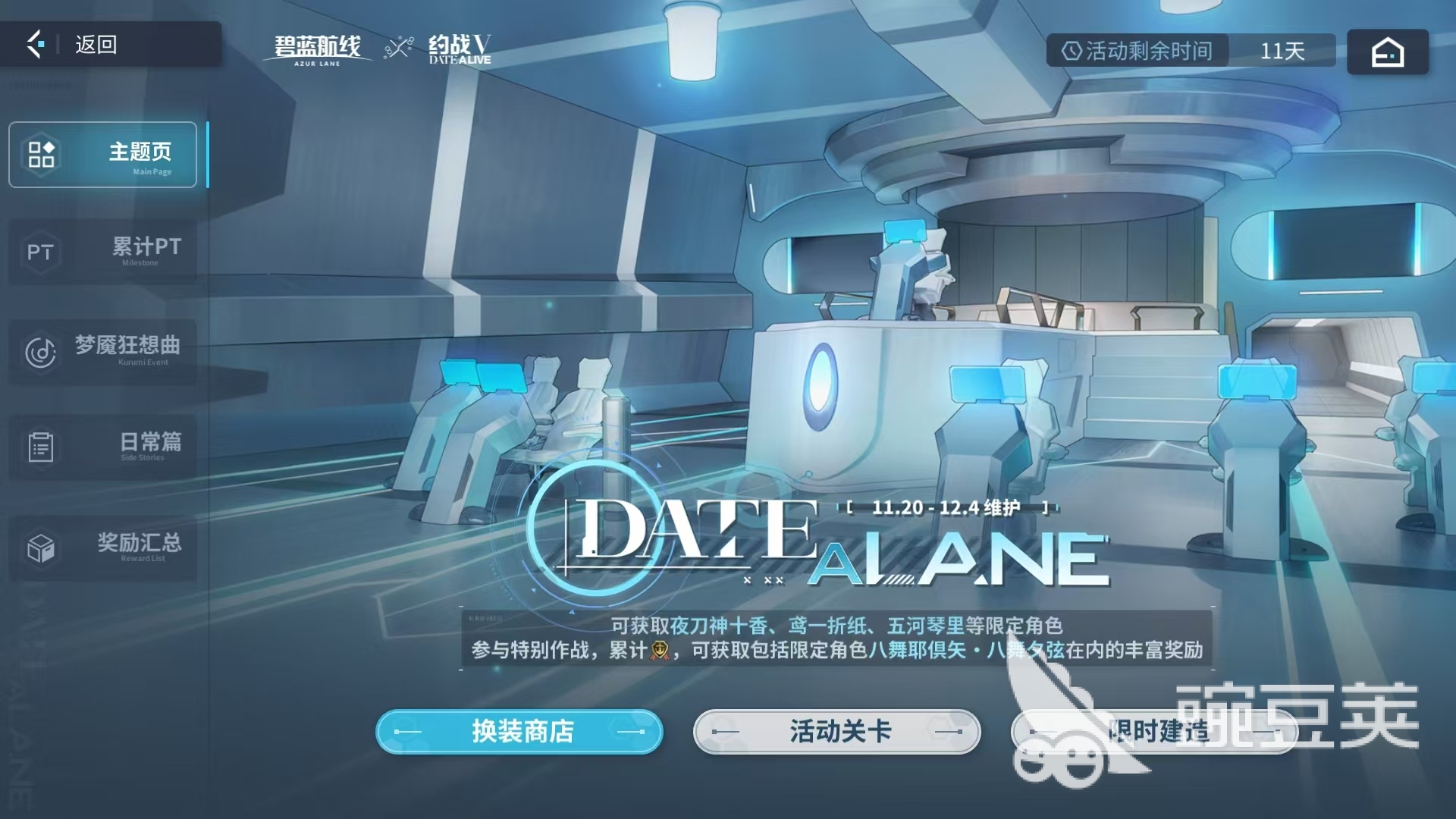 约战联动将从11月20日开启(2025年),直至12月4日后结束,时间相对充裕,玩家们可在本次活动内获取共计六名联动角色,且她们均为金船。其中,夜刀神十香(重巡)、鸢一折纸(航母)、五河琴理(战列)只能通过消耗魔方来进行抽取,而时崎狂三(轻巡)能通过战斗来完成梦魔音符的累积进行兑换,四系乃(轻航)则为PT累积奖励,双子金船八舞耶倶矢·八舞夕弦(轻巡)可通过抽取获得,也能在活动商店里用PT来兑换,亦或在活动关卡第六关打捞,获取方式多样。