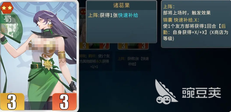 接下来为大家推荐的是诸葛果这个卡牌,在游戏当中的话,她是作为一个功能性武将使用的,不推荐大家前期使用时,主要是因为她的能力效果上面跟吞枪效果是比较类似的,但是整体的整容效果没有那么丝滑,所以后期在体系效果里面搭配了青龙来刷够足够属性的话,她能够带来的锁血目的还是非常强势的,有了这类效果后,既可以让她放在阵容里面,提升整体的能力。