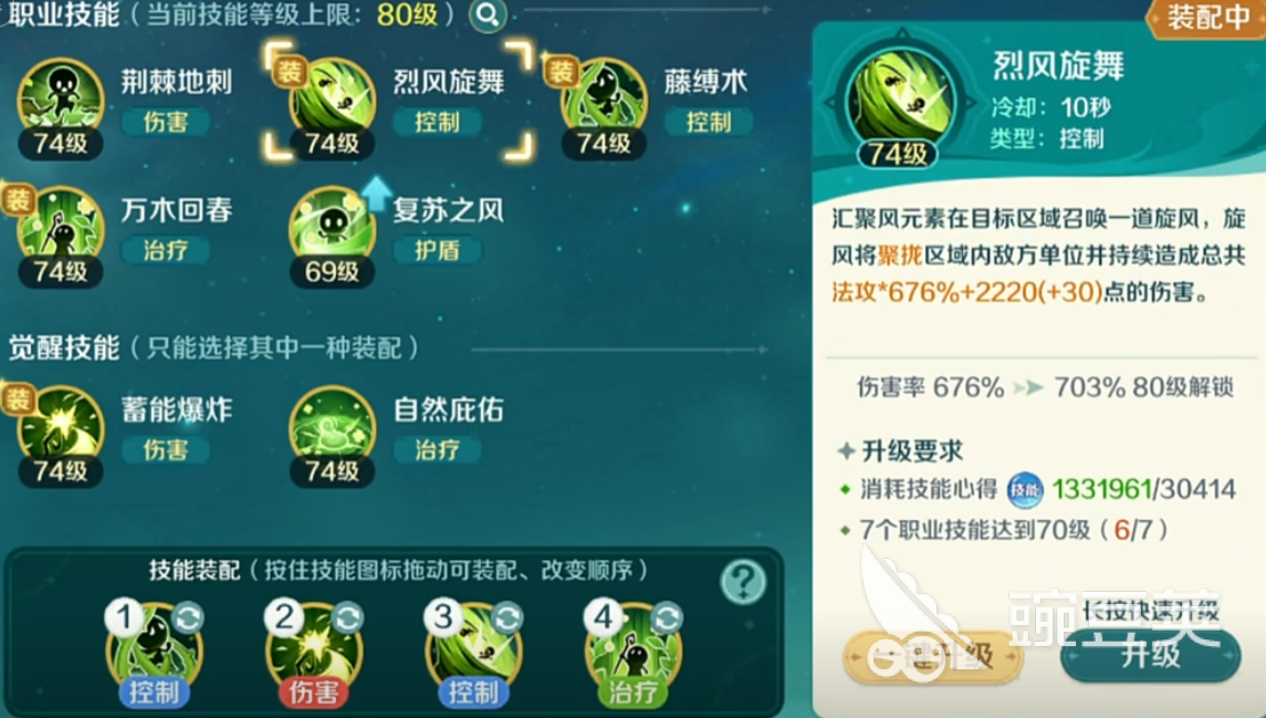 那么第二套呢,就是一个治疗效果比较好的搭配方案了,首先第一个就放复苏之风,然后还有万古回春,藤缚术以及自然庇佑,这个藤缚术主要是看大家的天赋效果,天赋这里可以看一下有这个藤缚术的话,使用技能它是有一个概率可以触发一点的生命水晶,那么这个生命水晶是用于触发被动技能的,所以这个治疗效大家一看可能就是说觉得这个几率太低了,但是在其中有足够的提升是可以把这里的触发几率直接变成百分百的,那么根据这样的天赋效果其实优先推荐的顺序呢,是万物回春,因为这个天赋效果可以带来足够的冷却。