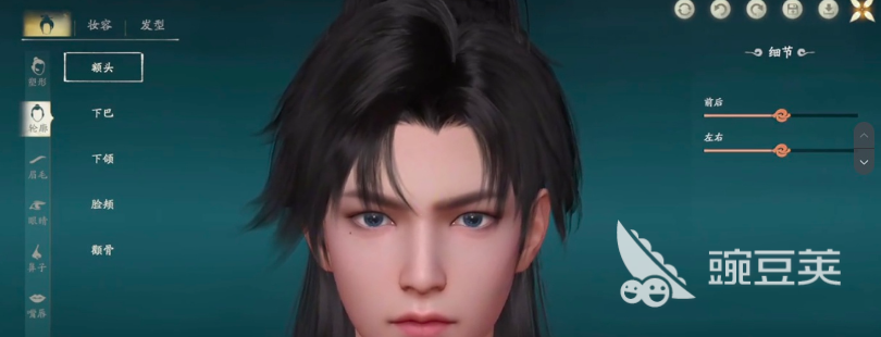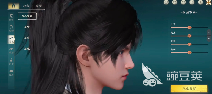 第二步再来调节眉毛,如果想要英气感更强的男性角色,可以考虑选择剑眉,将眉峰调制更明显,眉间距距的话可以稍微靠近一些,眉毛位置也应该更靠近于眼部,如果喜欢小奶狗形象在默认数据基础之上,完成略微的前后调整就可以了。