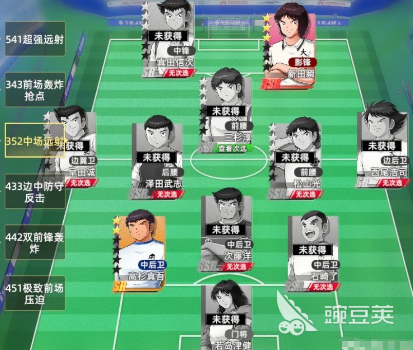 第三个为大家介绍的就是中场远射比较强势的队伍,这个队伍当中大家可以用到的战术循环角色是三杉淳、松山光,还有早田诚,他们搭配的阵型就是3-5-2,这个阵容当中其实主打的就是中场的球员,他们的能力,因为中场球员一般情况下限制远射进攻的话能够带来的得分情况还是比较多的,其次在前腰位置还有边翼位的位置以及中前卫上面他们带来的一些射门动作,大家在这里可以利用起来,如果进行远射的话,根据目前阵型的效果以及适配能力,可以根据中场球员带来足够的核心加成,如果有抢点进攻的话,大家用起来也可以有足够的强势球权,那么测试如果被对面针对的话,大家就注意其中的中锋角色以及隐锋角色都是可以用来进行抢点的,他们抢点的话成功概率比较大,然后也可以利用迎风的近射技能产生足够的射门动作,在射门动作成功之后,大家拿到球权就赶紧进行一个循环就可以了。