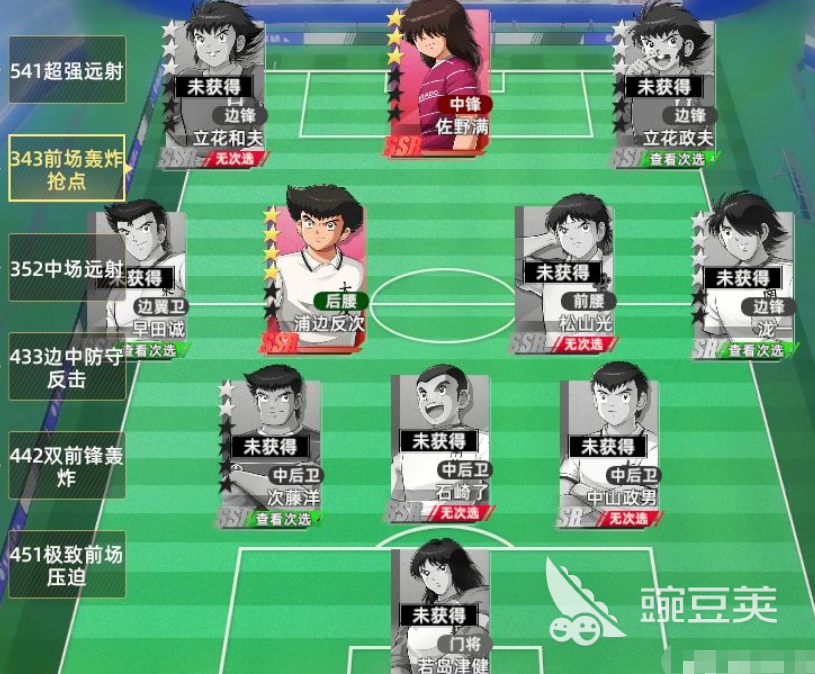 那么第二个阵容的话,大家可以找到一个前场适合轰炸强点的阵容搭配,这个阵容当中主要的角色利用立花和夫以及立花政夫,佐野满还有早田诚来进行战术循环,这里的话,主打的就是前锋球员的抢点进攻,因为他们进行进攻的话,自身的抢点数值都是比较强势的,然后中锋和边锋的话也可以用来抢点,这个阵型目前更是被于以前锋球员为主要核心的一个搭配方式,整体的球员效果上面,前锋球员如果有这样效果的话,那么这里整体阵容效果就不会差,当然如果大家进行抢点,如果是被攻击针对的话,那么此时大家也可以利用边锋劲射的角色来跟其他边翼位来搭配,使用边翼位进行远射的话,就可以保证整场球赛里面,远射跟近射可以交替使用,这个阵容里面,他们其他的位置大家都是可以根据图内的设定来进行搭配的。