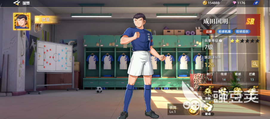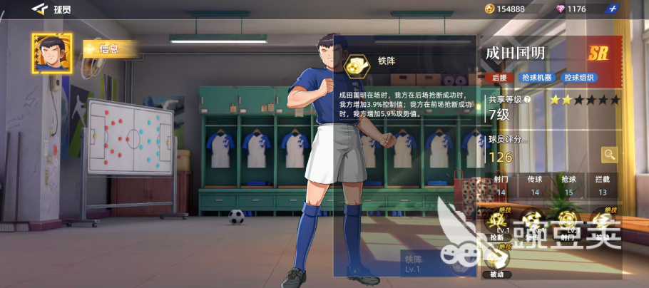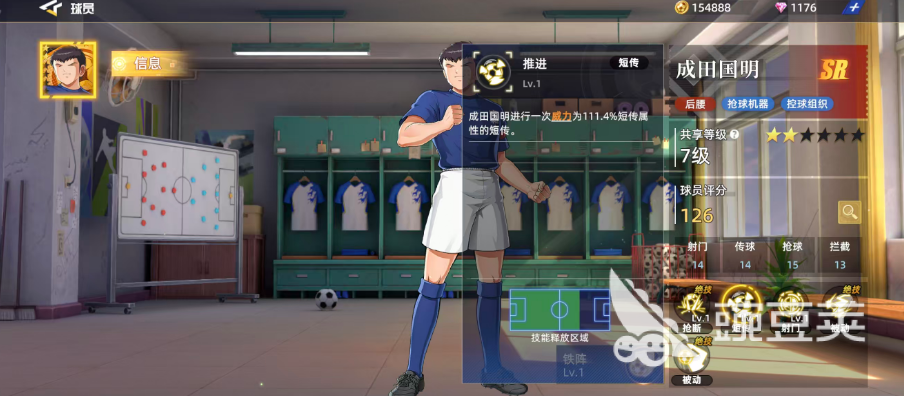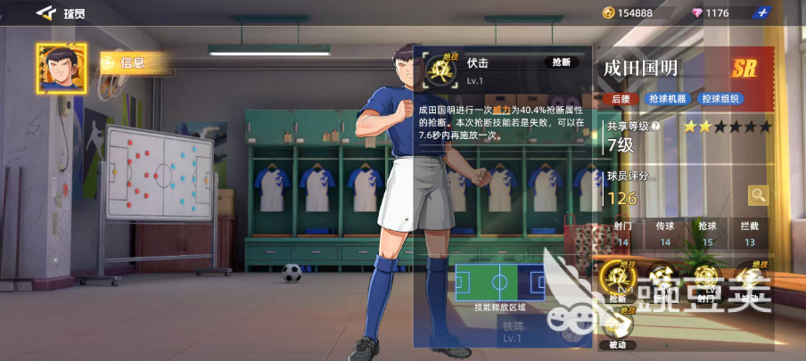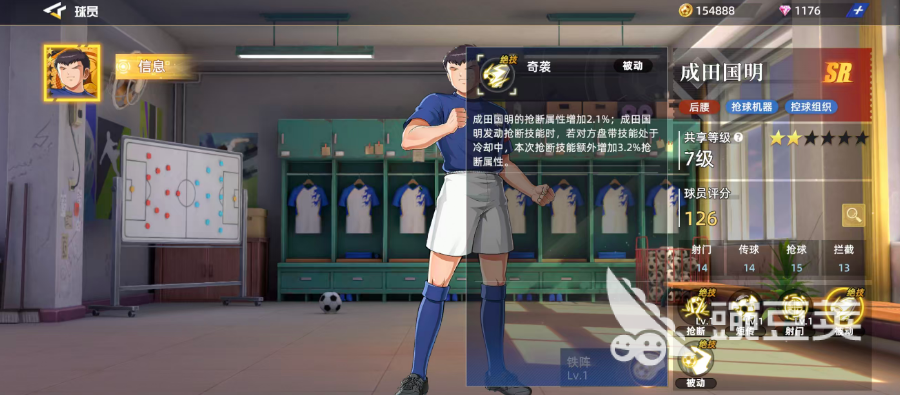 游戏当中成田国明作为SR角色的话,一般放在后腰位置上面使用能够带来的角色更突出,而且效果上面还可以当做抢球的优势角色来进行使用,这个球员目前他自身的总体评分达到了126的效果,所以在他的六维图上面,大家可以看到各项属性都比较平均的一个数值体现,初期如果要用他的优势技能的话,这里大家可以选择的是射门、传球、抢球、拦截四项属性效果,其中比较出色的就是抢球的属性,得分达到了15点的比分,而射门跟传球的评分效果目前是有14分,拦截的效果上面只有13分,根据目前的综合评价来说,他的各项属性还是算作比较平均的。