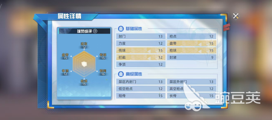 根据他的评分分开来看的话,在目前比较强势的几个属性里面,比如说盘带、传球、抢球、拦截当中前三个属性其实带来的数值都是15点的得分,那么这里还可以根据他的拦截12点的得分判断整体的六维图,在整体评分当中,大家还可以看到他的进攻以及争顶的效果都是比较弱的,所以作为边锋使用的话这类效果只有12点的得分,就说明他最好是根据其他的优势来为球队带来更多加成,那么使用其他技能效果的时候,第一个技能叫做鲨鱼盘球。