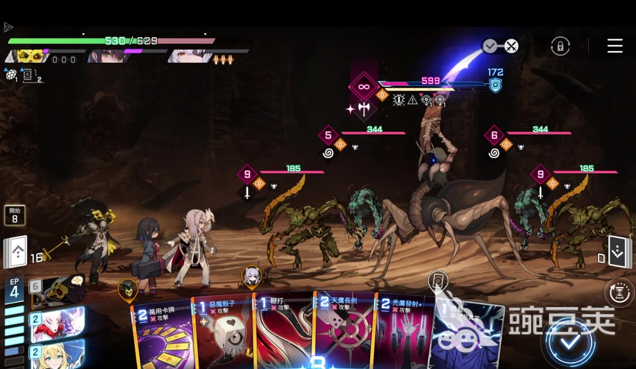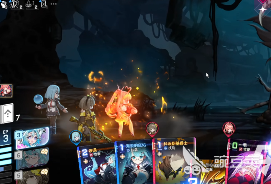 当队伍中两名角色完成属性强化之后,就可以开启总攻模式,集中使用高伤害的单体攻击卡牌,迅速地把蓝壶的剩余生命值给消耗掉。蓝壶的攻击频率会明显增加,间隔变短,所以玩家要特别注意治疗资源的使用。蓝壶进入残血状态的时候,治疗类卡牌的及时使用就显得非常重要了,要根据实际情况来灵活地使用,保证全员存活。配合斩杀机制的卡牌,在蓝壶血量低于一定数值的时候会触发额外伤害,可以很快地结束战斗。