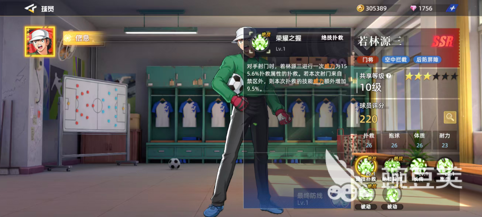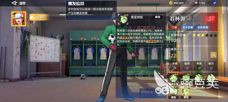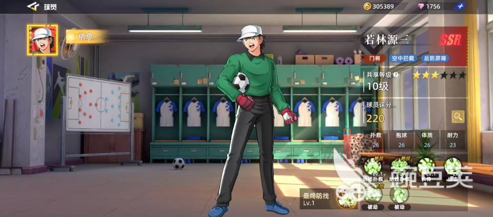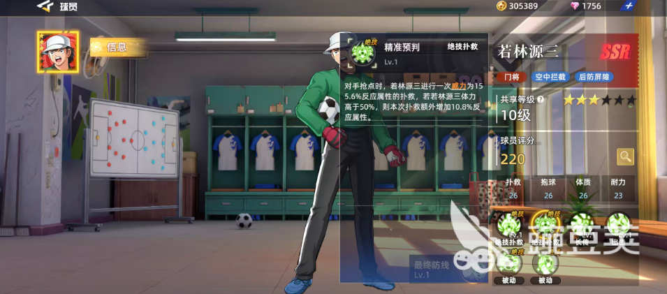 最后一个技能叫做最终防线,在比赛一开始的时候,若林源三凭借这个技能就可以获得3层【最终防线】,而且在若林源三每次扑救成功后获得1层【最终防线】,叠加到5层的时候最强,但是被进球后会移除全部层数,这里最终防线的效果就是增加若林源三16.6%扑救属性和16.6%反应属性增益哦。