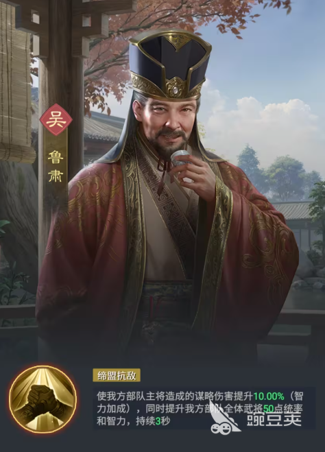 最后鲁肃的作为副将的话,在这里放在辅助位置上使用可以携带的技能效果,大家可以使用弓兵专精以及远程打击这类效果,因为他作为辅助武将使用的时候其实需要的能力都是通过兵种来进行加成,如果他自身有足够智力进行增益加成的情况下,全队的战斗能力都可以因为他的技能效果来得到足够的提升,那么后期他才为弓兵提供一定的攻击防御加成的时候,为队友带来的还有兵力上面的恢复效果,所以在战斗里面如果需要更好的状态,那么鲁肃放在阵容里面可以带来的效果比较全面,这里他恢复技能上面可以携带的就是军医以及智谋加持这两张技能卡。
