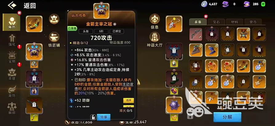 猎手玉扳指为他带来9%左右的普攻伤害提升之后,还有一定的生命加成,1000多点的生命加成,会让他后期在刻印之后,普攻获得20%的攻击速度加成,攻击速度对于攻击流来说也是非常重要的,而金箭主宰之冠其实是很多玩家玩弓箭流比较固定的一个搭配,它作为传奇品质的装备,经常会跟弓箭流的速射一起出现,它的能力都是会为弓箭流带来足够的速度加成,而且有一个造成定身的能力,会让敌人持续两秒站在原地,所以这样的效果放在弓箭流里面使用起来的话,非常适合搭配蓄力输出,最后的魔力护腿带来的也是生命数值以及速度加成的效果。