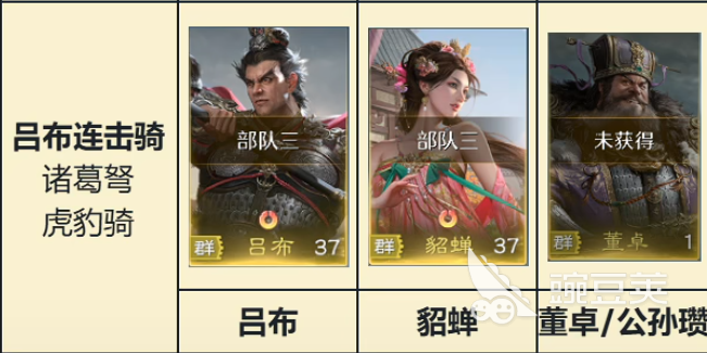 那第2个是吕布连击骑阵容,这个阵容当中就是一定要带突击技能,然后因为貂蝉她是如果你普攻次数多的话,她的伤害也高嘛,那这时候三后卫就放董卓,董卓的效果,是普攻就会附加威压,威压就是一个10%的增伤,扣敌方全体50点的效果,然后如果这个持续时间会刷新的话,那基本上就是能一直叠满,就全程扣对方50点统帅值,所以董卓在这里用也是可以的,但是如果你不用董卓的话,就用公孙瓒能加这个连击,让这个吕布这个突击技能打的更多。
