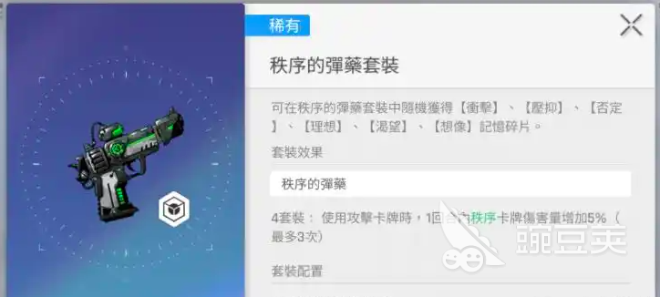 第三种搭配思路是攻击强化流,选择制取的弹药四件套和黑翼两件套,这一套装与雨果的适配度很高,也可以尝试在一些高频攻击的基础卡牌角色身上使用,其中秩序的弹药可对基础卡还进行专门强化,而黑翼则可对攻击力进行提升,每一次的普攻也能够达到非常不错的效果,对于早期将获得雨果的卡牌的玩家来说,可尝试。