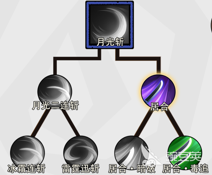 技能加点逻辑高度聚焦:优先解锁基础技能“月光斩”,随后必须投入关键分支——“居合”与“居合毒追”。这两项技能构成整套循环的根基,其余非核心输出技可完全舍弃,确保有限技能点集中于核心链路,避免资源浪费。