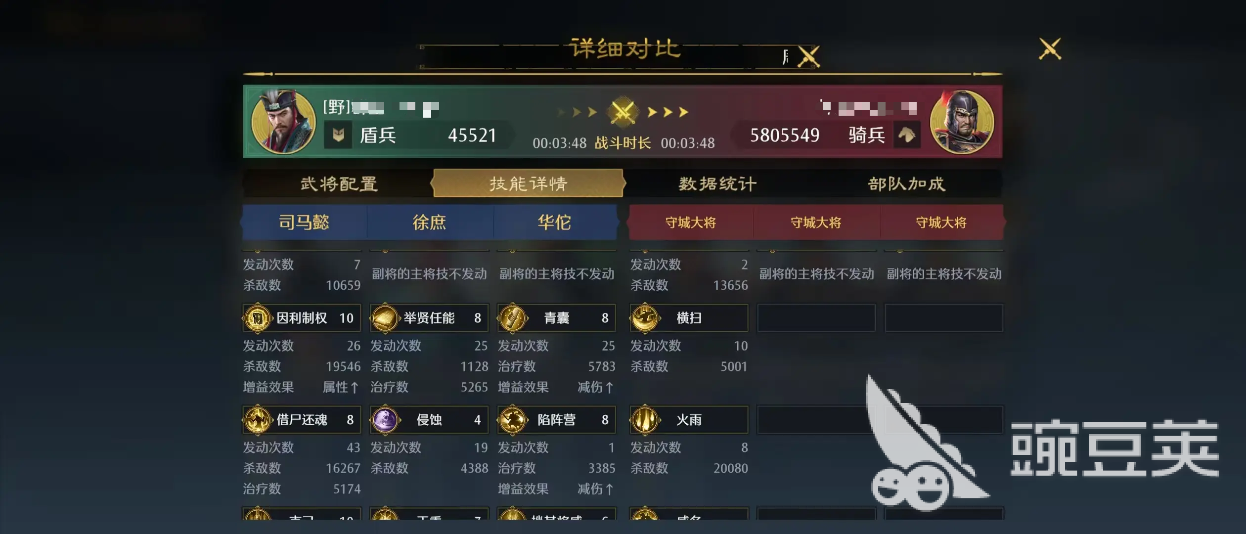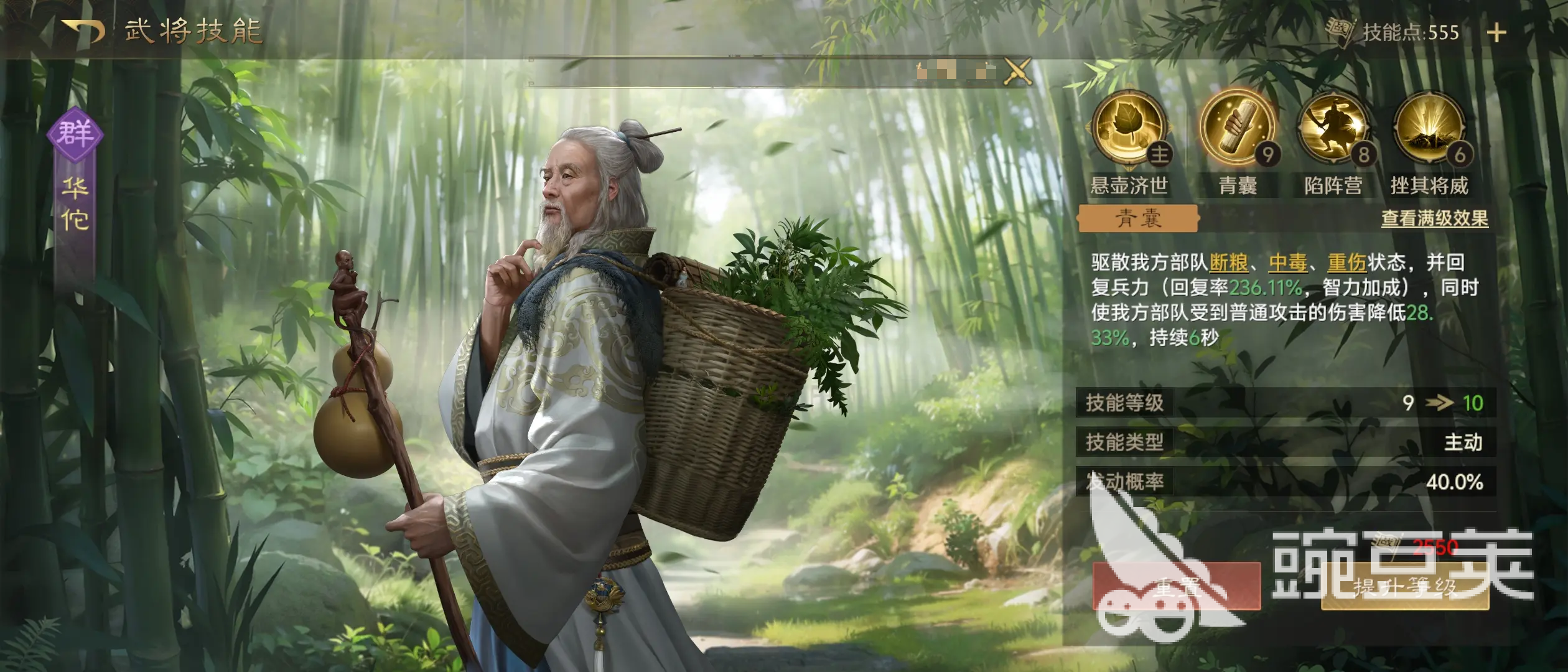 华佗担任专职治疗与净化角色。其战法提供高额群体恢复,并附带驱散控制效果,可有效清除敌方施加的缴械、计穷、混乱等负面状态,保障司马懿与徐庶的战法释放频率。在面对高控阵容时,该净化能力成为队伍稳定运转的关键支点。