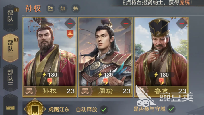 在搭配阵容时,可以选择周瑜、鲁肃,还有孙权等人。在这一个阵容中,孙权是主将。核心的作用是加快全队的技能循环,所以技能选择上应该要兼顾怒气回复,还有兵力续航。可以给孙权加怒气技能,可以让他更快的释放虎踞江东技能,同时搭配一个伤害回血技能。在保证输出的同时,还可以维持自身的兵力,可以避免过早退场。孙权的兵力,还有骑兵的士性,全部都是s级,领兵达到14,200,统帅还有智力的属性都是很亮眼的,可以扛起主将的重任。