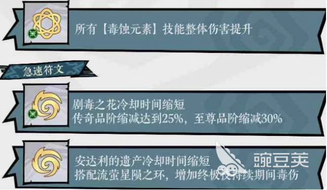 如果这里的冷却时间大家觉得不太够的话,还可以通过这个装备来叠加38%左右的冷却时间加成,后期在符文加成上面也会有30%的数值以及大招效果的加成,所以给毒花装配这个毕业套装之后,毒花流里面大家就可以注意,同时在场上存在的毒花就可以有12朵了,通过这样的割草能力在装备词条上面,能够带来的效果大家也要注意优先级最高的一个推荐是毒蚀元素。
