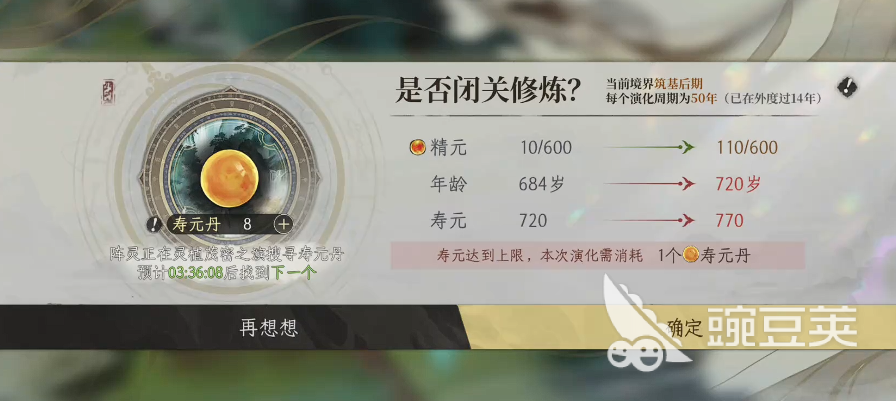 那么在闭关时期当中对于角色来说消耗的就是年龄,所以在年龄的消耗上面,大家一定要注意自己的寿元上限,如果达到上限的话,没有足够的精元那么此时在修炼上面就会进入一个停滞的阶段,一旦进入停滞阶段,后期大家想要快速的达到修为升级就比较难了,所以这里的精元数值以及演化的时间,还有大家的寿元的数值一定要计算好,同步进行提升,那么这里寿元的重要性也是非常重要的,所以大家要注意,前期一般系统给到的任务当中也会送给大家一些寿元丹作为基础的任务奖励。