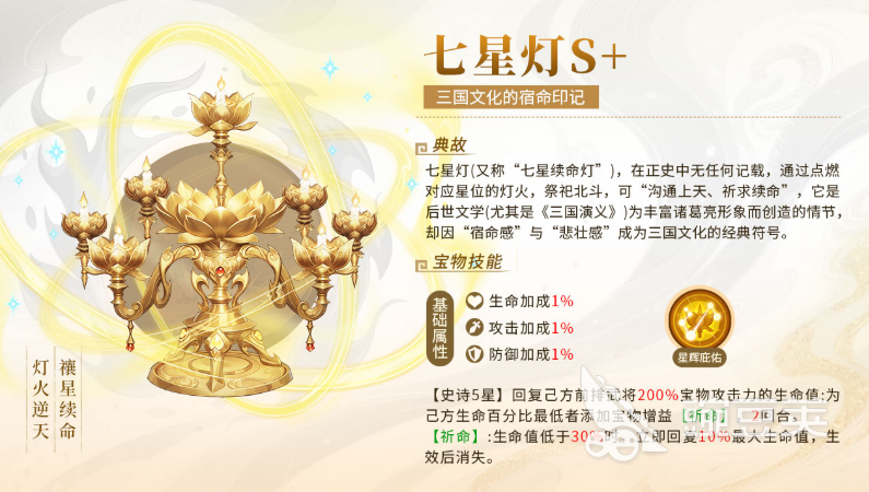 最后为大家推荐的就是S+品质的七星灯,这个宝物相对来说品质是跟上面诸葛连弩一样的,所以在基础的三种手机效果上面也是只有1%的提升能力,但是在额外的技能效果上面可以用的就是新规必有这个技能效果,一般情况下是用来给前排角色使用的,因为前排角色一般是肉盾用法,所以在这里利用七星灯就可以给前排的角色带来生命数值的恢复,而且可以给目前我方血量数值最低的一个友方单位带来一个请命效果,前面的效果就是在目前它的生命值低于30%的时候,就可以带来10%的最大生命数值恢复,而且在团队需要的时候它也可以带来另外的一个生存加成在关键节点上面,且带来的这个生命数值加成效果还是非常不错的。