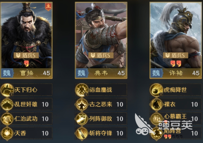 在游戏里想要组建反击盾的阵容,最推荐的就是选择魏国阵营里的角色,在这个阵营中可以把曹操,典韦和许褚这三个角色搭配在一起,首先这三个角色都是盾兵,组合起来能有非常强的抵抗能力,每个成员在队伍里都能起到不同的作用,曹操在游戏里可以提供治疗和减伤的作用,利用这个角色的技能,可以增强整个队伍的续航能力,整体的伤害也能得到一定的提升,即便是新手玩家也能借助曹操的能力,让自己有更强的抵抗力。