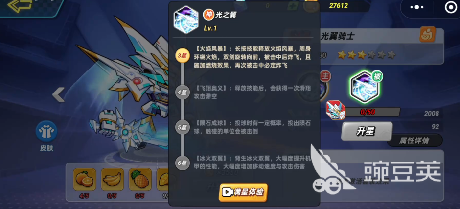 被动技能“光之翼”随星级解锁不同强化形态:达到3星时激活“火焰风暴”,长按释放环形火焰,击退周围单位并附加持续燃烧伤害,适用于被围攻时的反打与空间争夺;升至4星后解锁“飞翔奥义”,技能释放后可滞空滑翔,规避地面控制效果,并支撑空中连招衔接,显著增强生存韧性与追击灵活性。