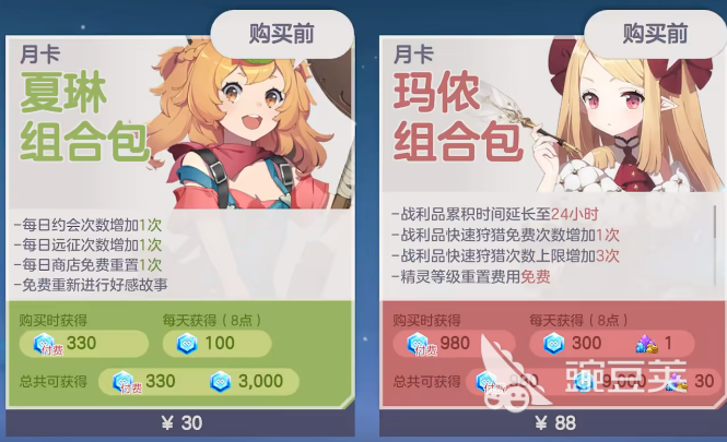 另外还有很多其他角色的召唤概率提升礼包,如果玩家迫切想要获取某个角色,就可以尝试购买这些礼包,真的也比较喜欢氪金的玩家,里面还会有大量的新手礼包,会分为每天的价值礼包,召唤礼包和成长礼包多种不同的类型,这些礼包里包含的物品也不一样,有需要的可以去商店里查看每个礼包里的详细物品,最后就是游戏里的月卡,里面会针对夏林和玛农设置两个组合包,可以借助这些礼包增加约会或者是免费狩猎的次数。