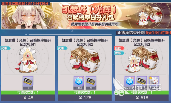 除了这些基础的服装,可以让玩家氪金之外,还可以在游戏里购买特定的礼包,挑战开启之后,玩家可以选择的角色很多,这些角色除了外观上的差异之外,战斗力也有一定的区别,凯瑟琳(光辉)有着比较优秀的战斗能力,很多玩家都想要快速获取,一种方法是通过商店购买更多的抽卡次数,通过频繁的抽卡获得这个角色,另外就是在商店里购买纪念礼包,除了抽卡次数之外,也能得到大量的奖励。
