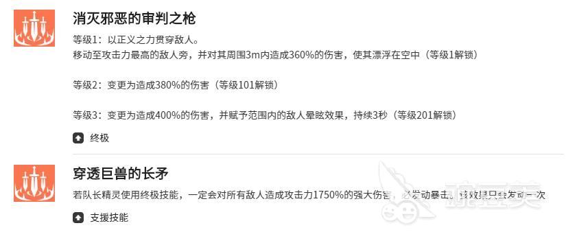 上面都是一些比较基础的技能,消灭邪恶的审判之枪是终极技能,会比所有的技能战斗力都更强一些,在对战的过程中,能用正义之力贯穿对手,周围3m之内出现对手的话,还能让对方漂浮在空中,这时候队伍里的其他成员就可以集结能力进行攻击,穿透巨兽的长矛是支援技能,使用这项技能之后,就能给所有的敌人带来强大的攻击伤害,但这个技能只能在游戏里发动一次。