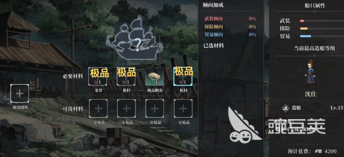 在造船的时候就有很多的关键信息,例如造船有概率会跨界出其他的船体。例如我用的是福船的图纸,但是很有可能就会造出开浪船或者是哨船。这一类的惊喜,其实全部都是看运气,但是选对船的材料,就可以让目标更加的明确。另外,白板船还有自定义造船,基础属性是一样的,差别只不过是在词条这一方面。