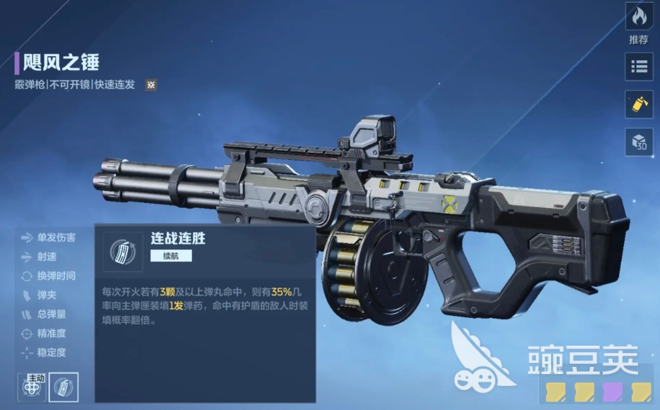 飓风之锤是把在猎场模式里很好用的霰弹枪,它可在开启主动技能后切换为四连发模式,从而在持续时间内打出极高的爆发,尤其在些对输出节奏有要求的图里,飓风之锤能凭借主动技能轻松打满伤害。而且它的被动还可主动填弹,命中敌人时概率翻倍特性也适合护盾怪较多的猎场环境。